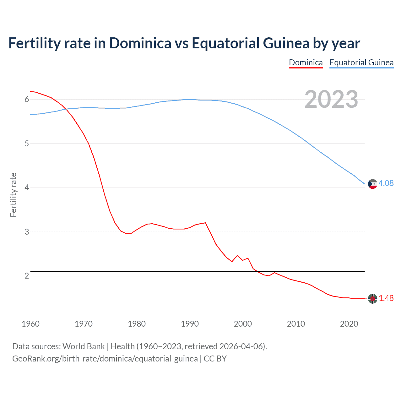 According to the latest available data on birth rates, the fertility rate in Dominica was 1.48 children per woman in 2023, compared to 4.08 in Equatorial Guinea in 2023. The replacement level is considered to be 2.1 children per woman.