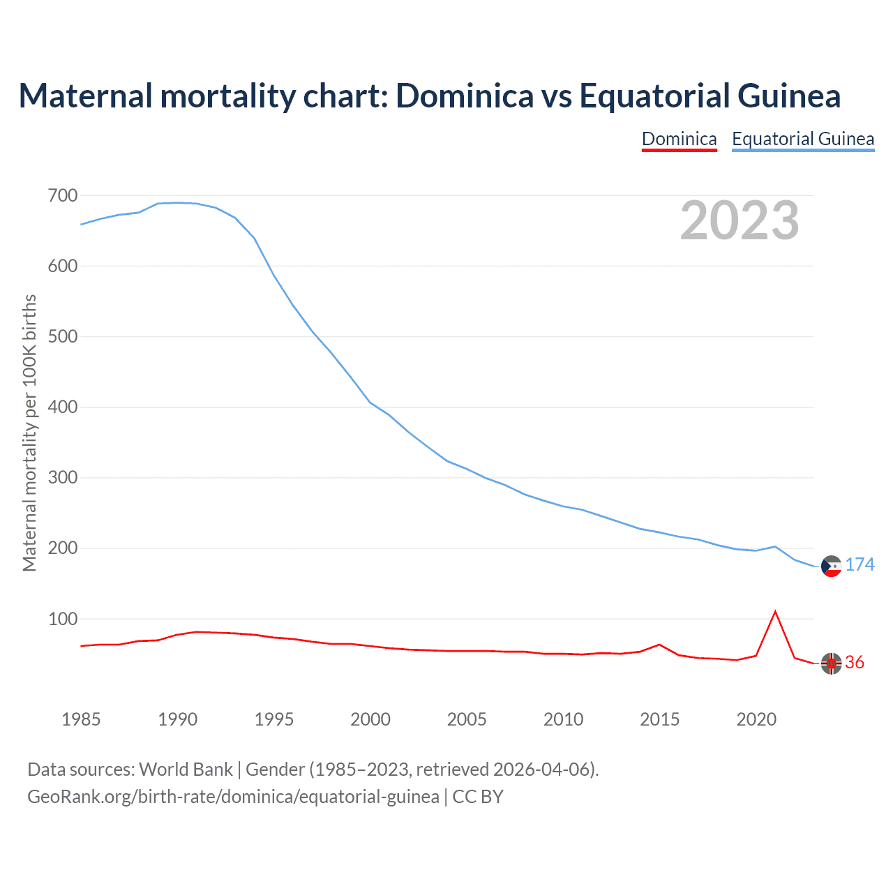 The maternal mortality rate, which is the probability of dying during childbirth or within 42 days of pregnancy termination, is 36 deaths per 100,000 live births in Dominica, compared to 174 deaths in Equatorial Guinea.
