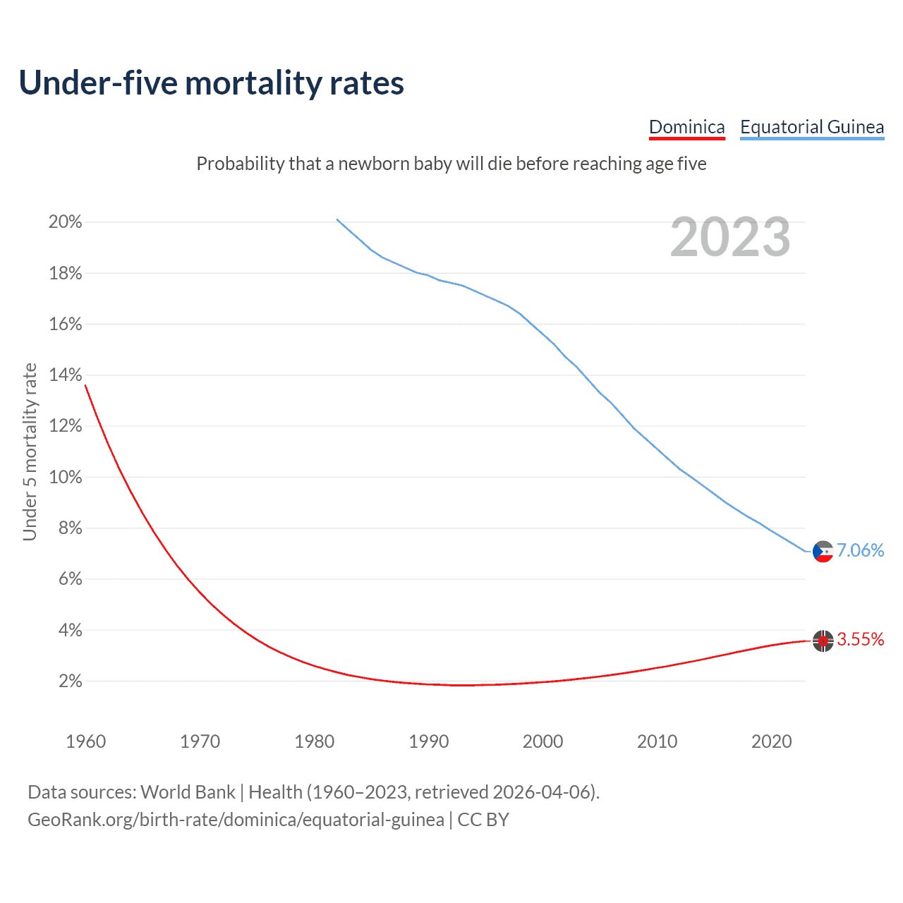 The chance that a newborn baby will die before reaching age five is 3.55% in Dominica and 7.06% in Equatorial Guinea. Above is a chart with historical data on under-five mortality rates.