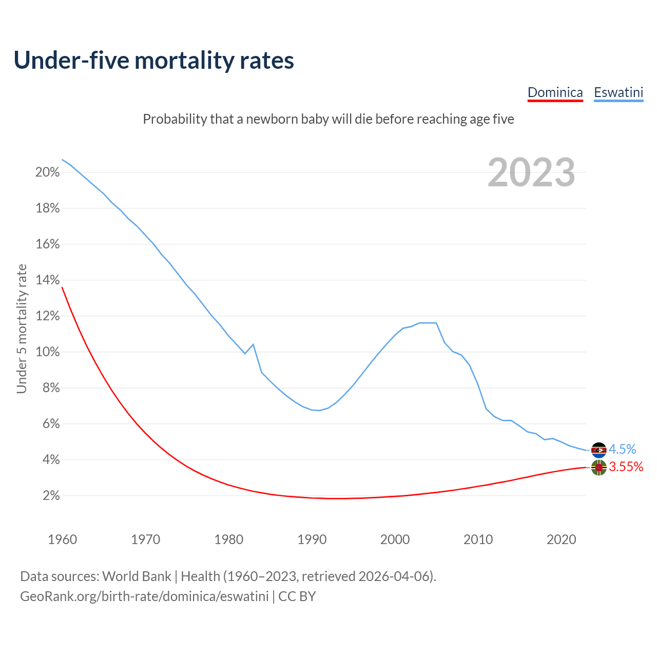 The chance that a newborn baby will die before reaching age five is 3.55% in Dominica and 4.5% in Eswatini. Above is a chart with historical data on under-five mortality rates.