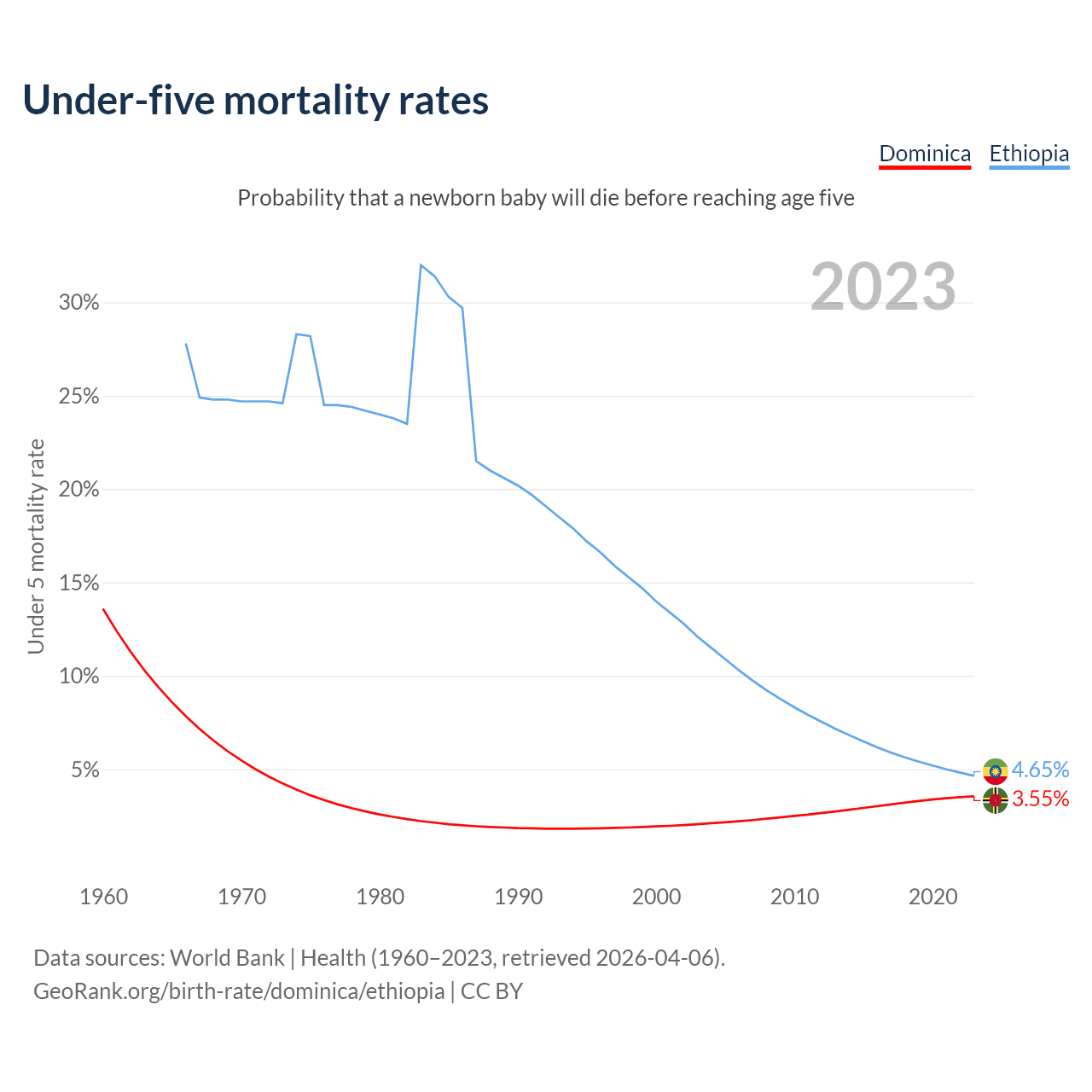 The chance that a newborn baby will die before reaching age five is 3.55% in Dominica and 4.65% in Ethiopia. Above is a chart with historical data on under-five mortality rates.