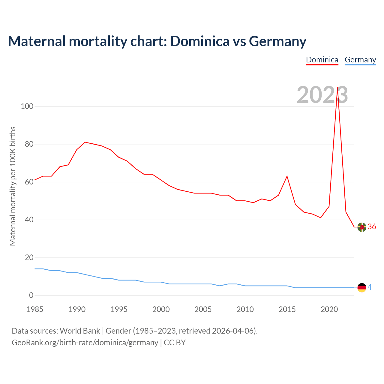 The maternal mortality rate, which is the probability of dying during childbirth or within 42 days of pregnancy termination, is 36 deaths per 100,000 live births in Dominica, compared to 4 deaths in Germany.