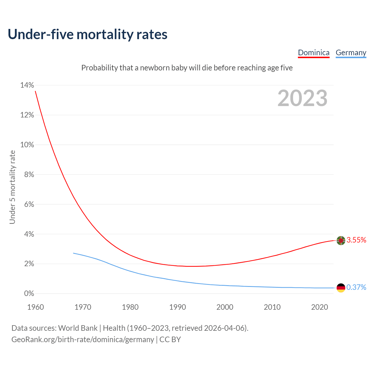 The chance that a newborn baby will die before reaching age five is 3.55% in Dominica and 0.37% in Germany. Above is a chart with historical data on under-five mortality rates.