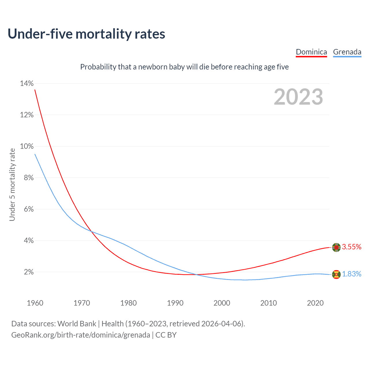 The chance that a newborn baby will die before reaching age five is 3.55% in Dominica and 1.83% in Grenada. Above is a chart with historical data on under-five mortality rates.