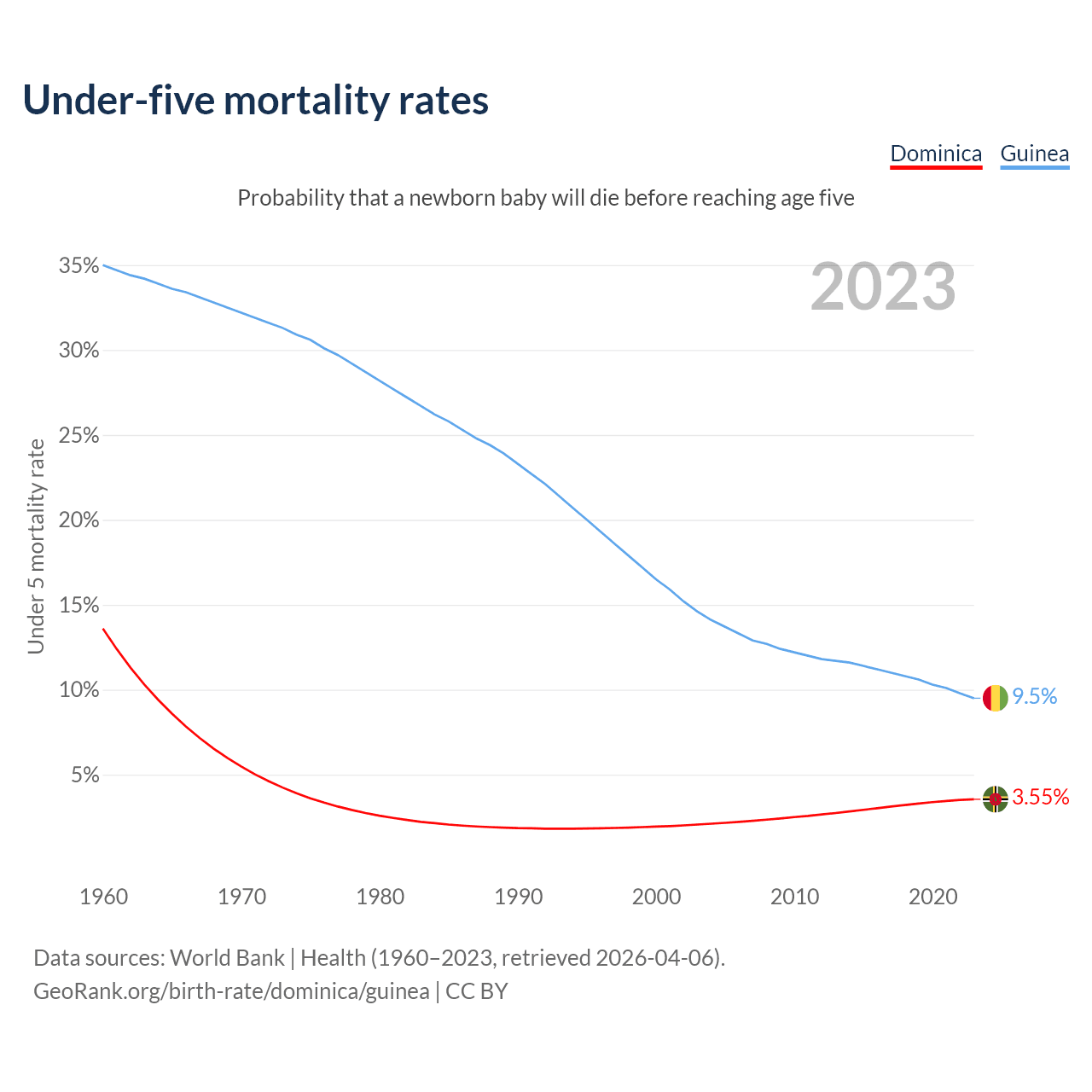 The chance that a newborn baby will die before reaching age five is 3.55% in Dominica and 9.5% in Guinea. Above is a chart with historical data on under-five mortality rates.