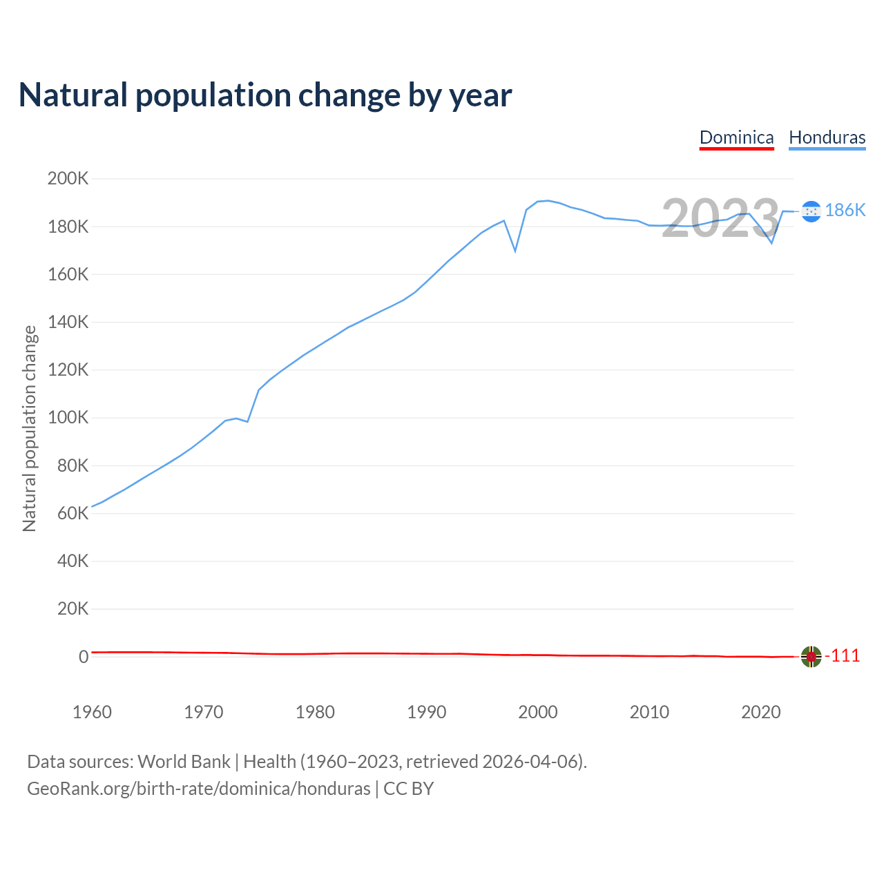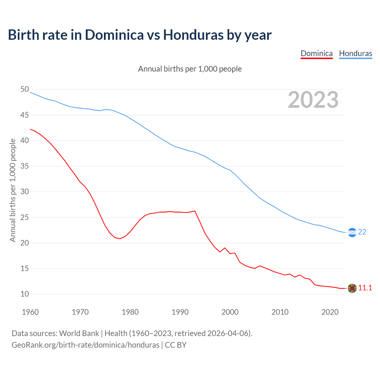 According to the latest available data on birth rates, the fertility rate in Dominica was 1.48 children per woman in 2023, compared to 2.5 in Honduras in 2023. The replacement level is considered to be 2.1 children per woman.