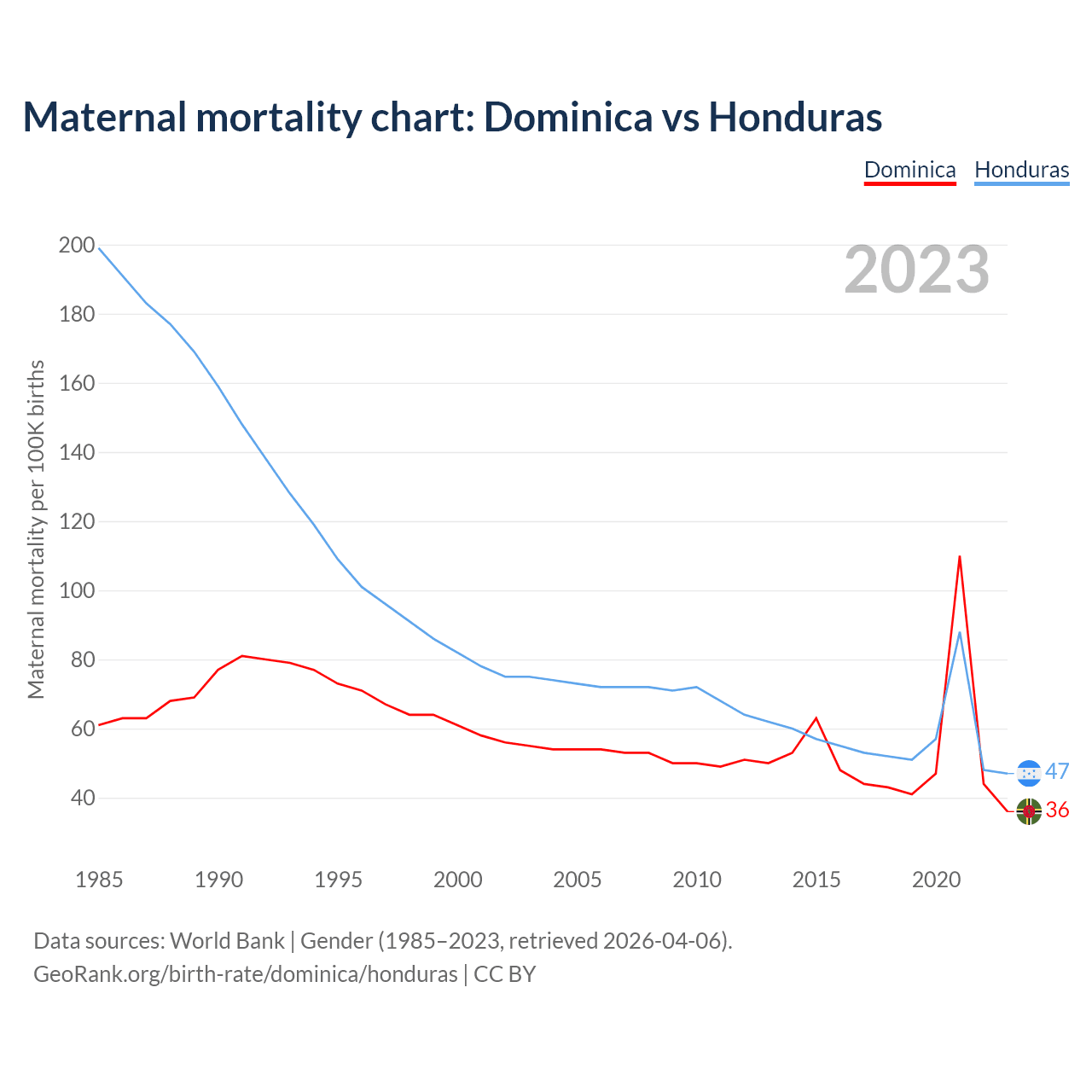 The maternal mortality rate, which is the probability of dying during childbirth or within 42 days of pregnancy termination, is 36 deaths per 100,000 live births in Dominica, compared to 47 deaths in Honduras.