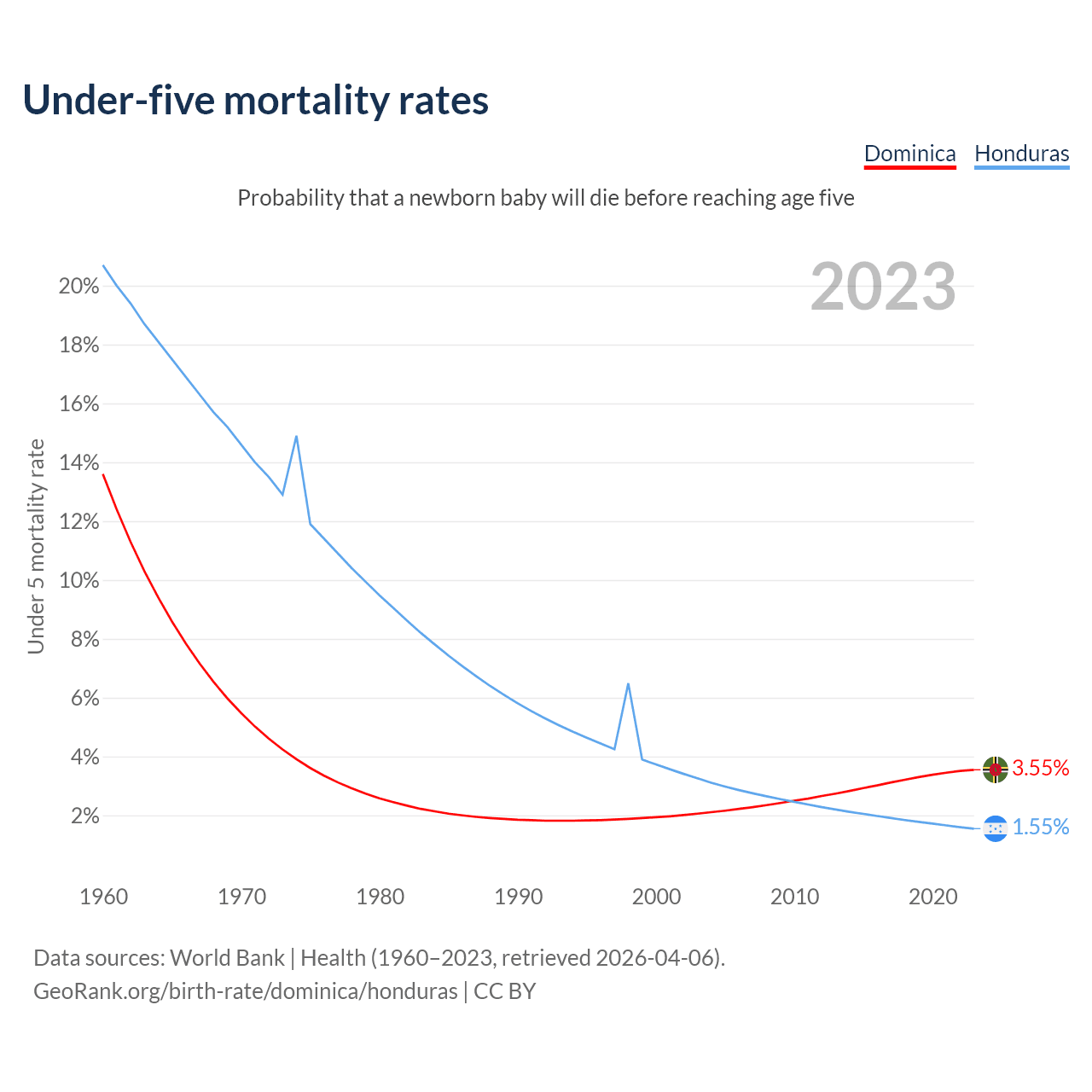 The chance that a newborn baby will die before reaching age five is 3.55% in Dominica and 1.55% in Honduras. Above is a chart with historical data on under-five mortality rates.