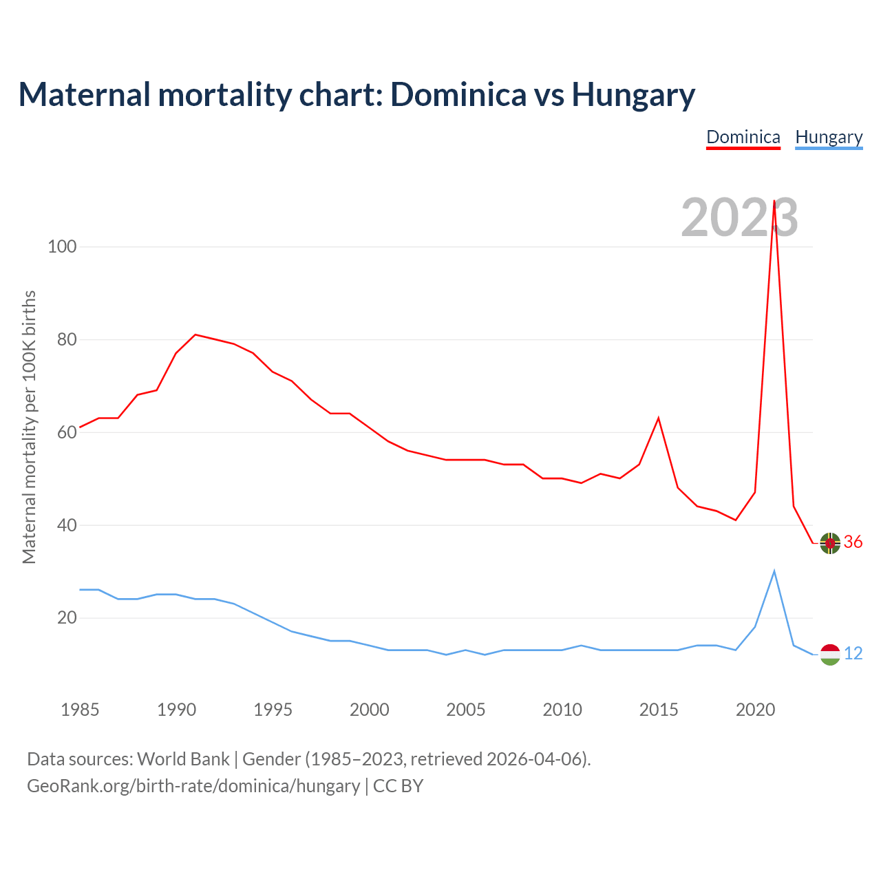 The maternal mortality rate, which is the probability of dying during childbirth or within 42 days of pregnancy termination, is 36 deaths per 100,000 live births in Dominica, compared to 12 deaths in Hungary.