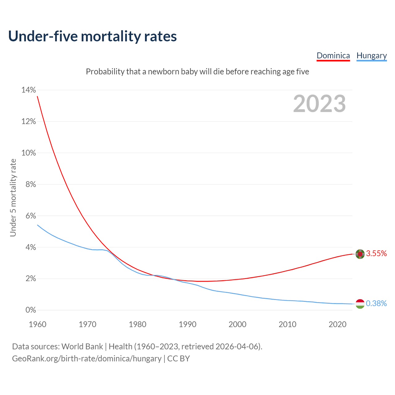 The chance that a newborn baby will die before reaching age five is 3.55% in Dominica and 0.38% in Hungary. Above is a chart with historical data on under-five mortality rates.