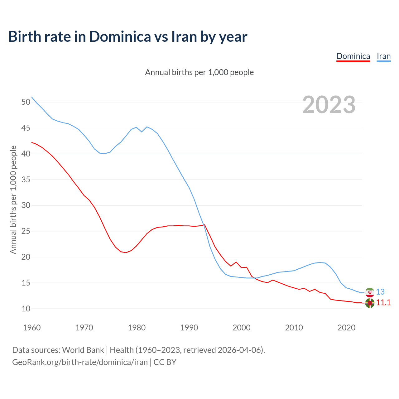 Dominica has an annual birth rate of 11.1 births per 1,000 people, compared to 13 for Iran. The average number of children a woman is expected to have during her lifetime — the fertility rate, is 1.48 in Dominica and 1.7 in Iran — 14.2% difference.