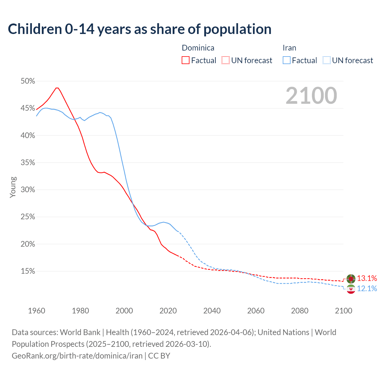 According to the latest available data on birth rates, the fertility rate in Dominica was 1.48 children per woman in 2023, compared to 1.7 in Iran in 2023. The replacement level is considered to be 2.1 children per woman.