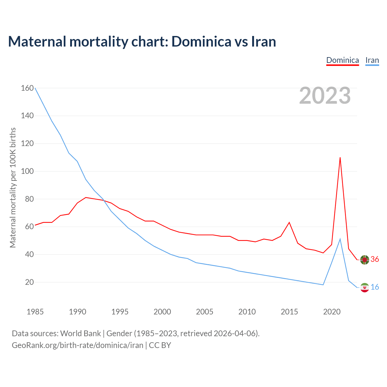 The maternal mortality rate, which is the probability of dying during childbirth or within 42 days of pregnancy termination, is 36 deaths per 100,000 live births in Dominica, compared to 16 deaths in Iran.