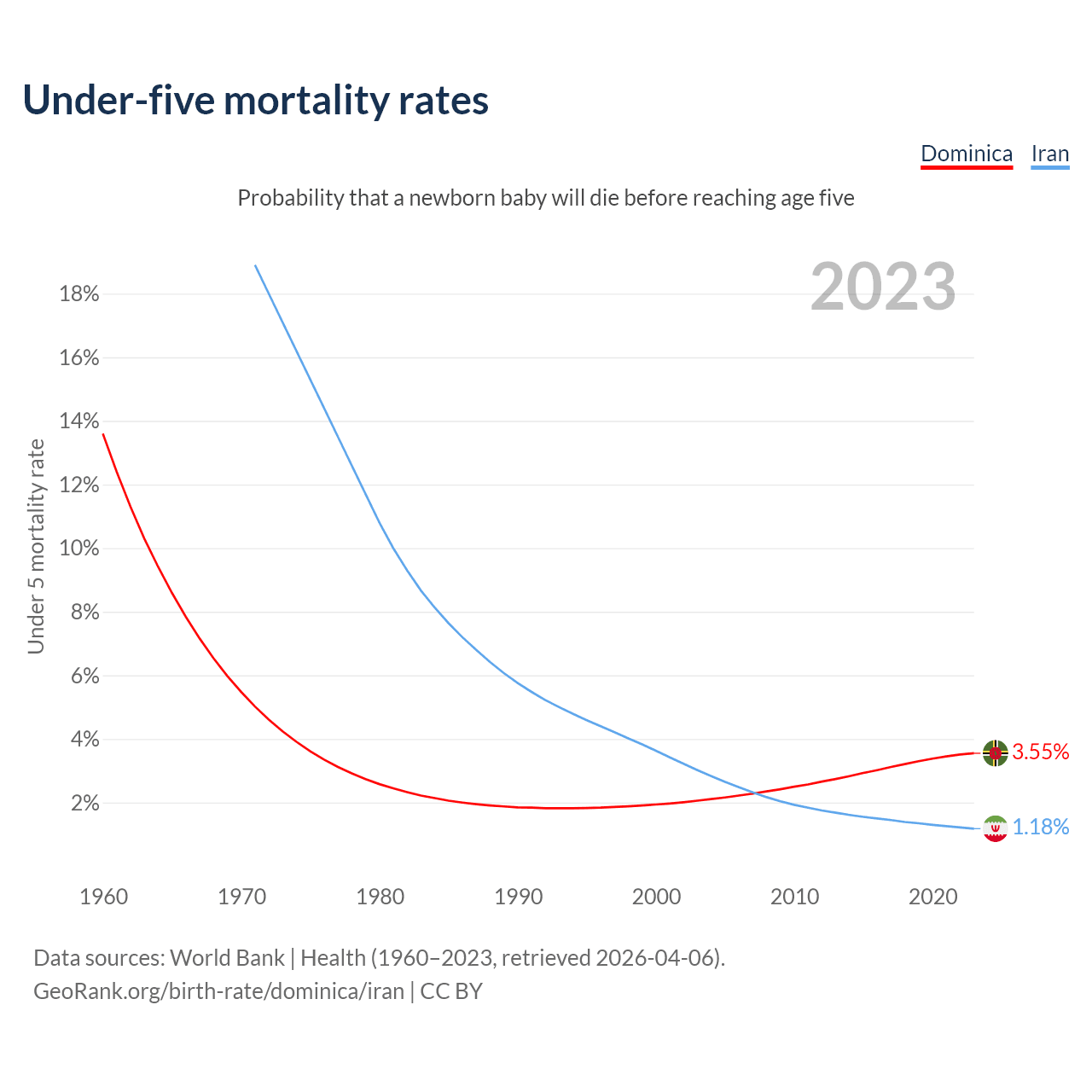 The chance that a newborn baby will die before reaching age five is 3.55% in Dominica and 1.18% in Iran. Above is a chart with historical data on under-five mortality rates.