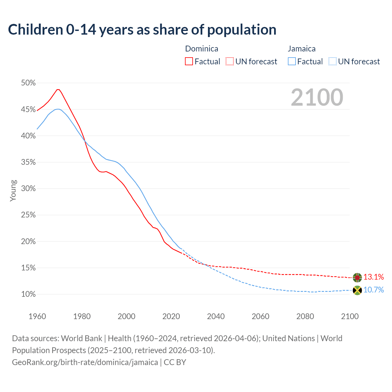 According to the latest available data on birth rates, the fertility rate in Dominica was 1.48 children per woman in 2023, compared to 1.36 in Jamaica in 2023. The replacement level is considered to be 2.1 children per woman.