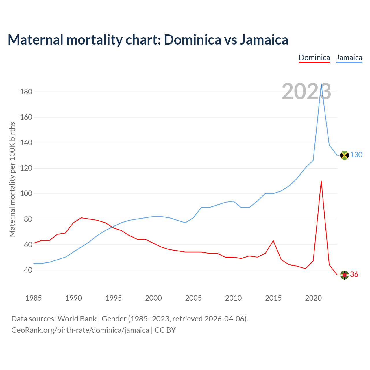 The maternal mortality rate, which is the probability of dying during childbirth or within 42 days of pregnancy termination, is 36 deaths per 100,000 live births in Dominica, compared to 130 deaths in Jamaica.
