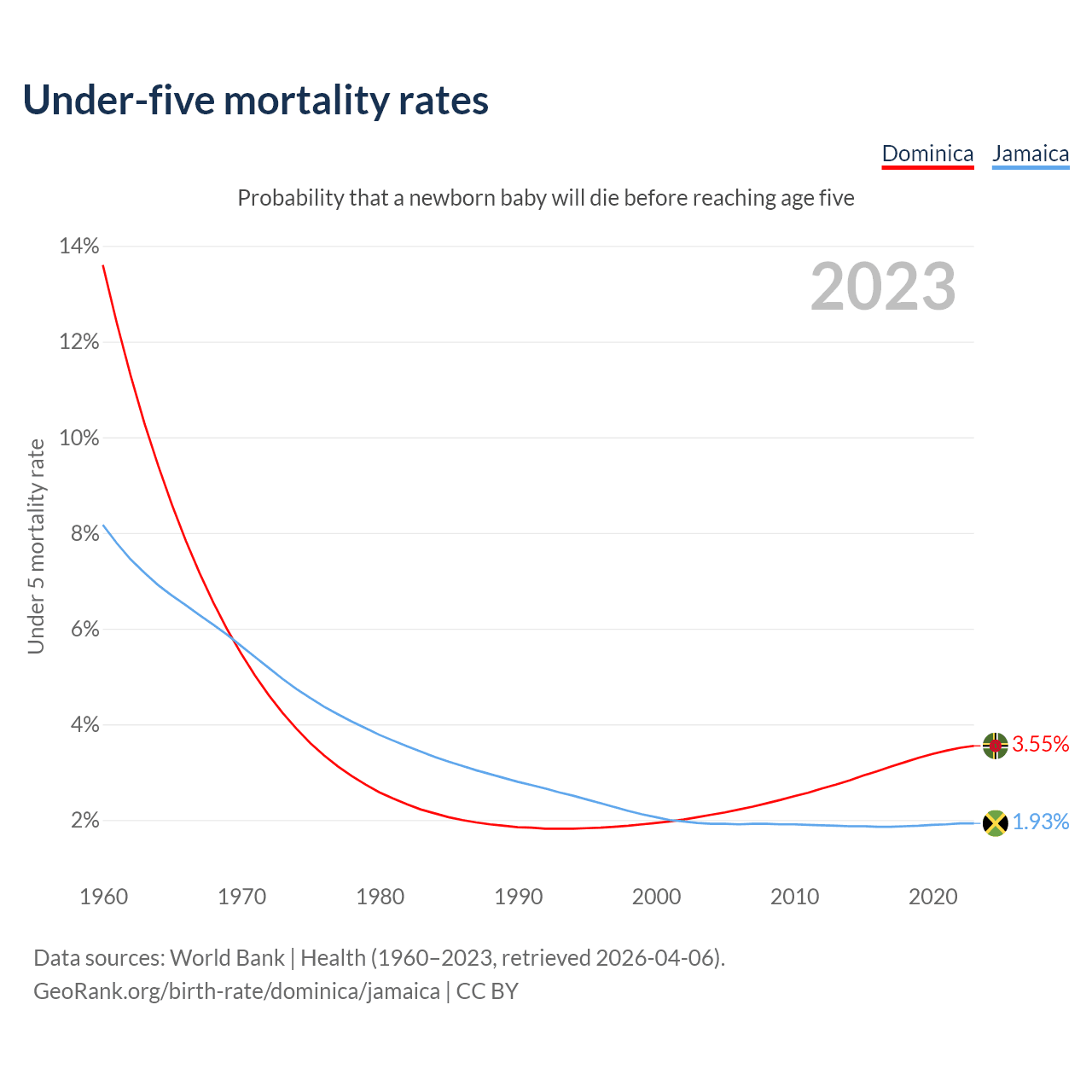 The chance that a newborn baby will die before reaching age five is 3.55% in Dominica and 1.93% in Jamaica. Above is a chart with historical data on under-five mortality rates.