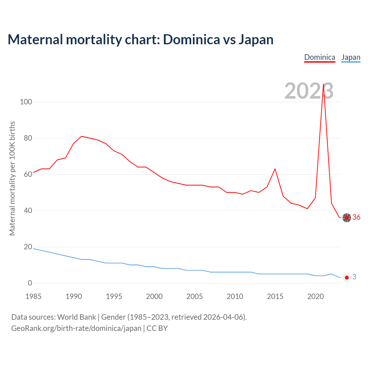 The maternal mortality rate, which is the probability of dying during childbirth or within 42 days of pregnancy termination, is 36 deaths per 100,000 live births in Dominica, compared to 3 deaths in Japan.