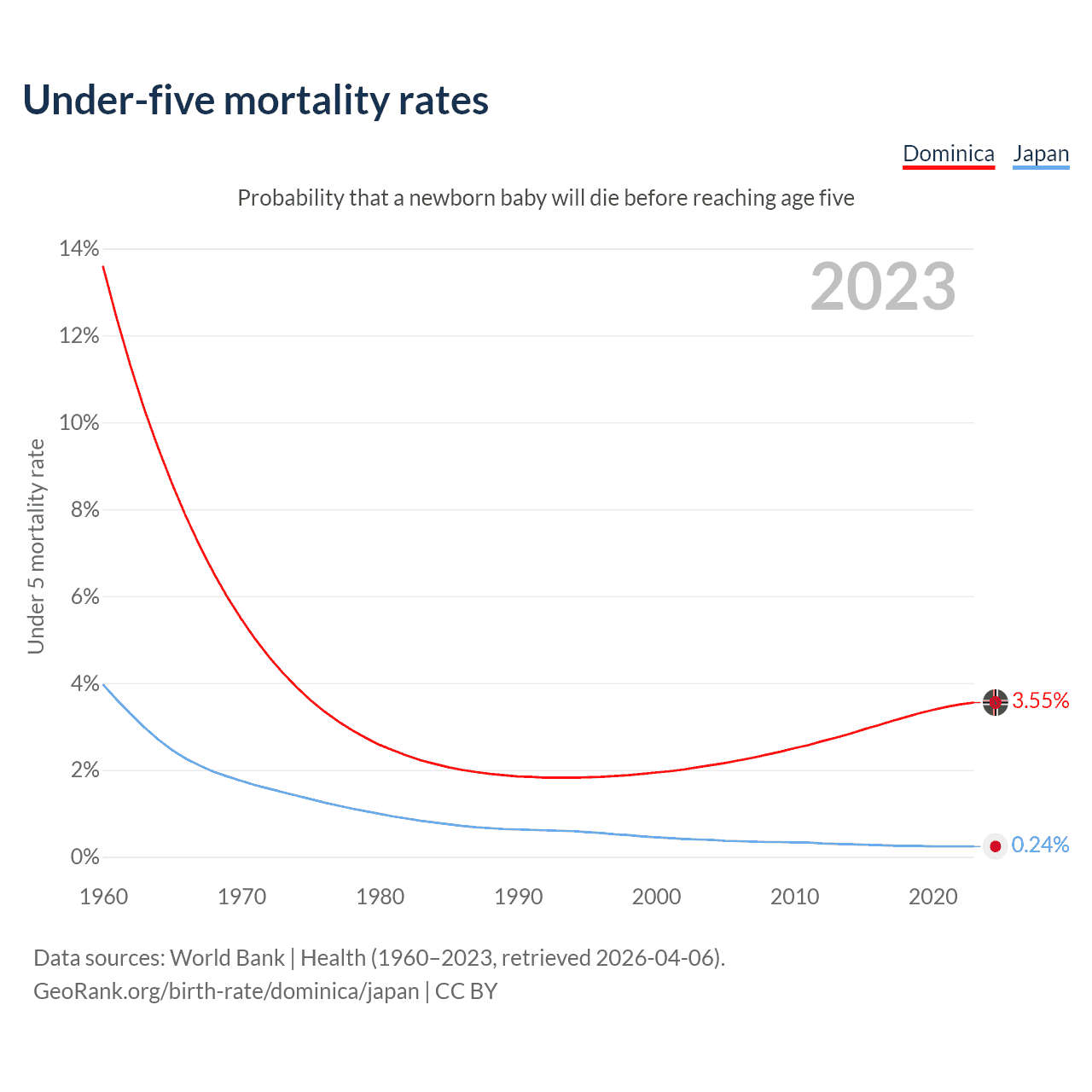 The chance that a newborn baby will die before reaching age five is 3.55% in Dominica and 0.24% in Japan. Above is a chart with historical data on under-five mortality rates.