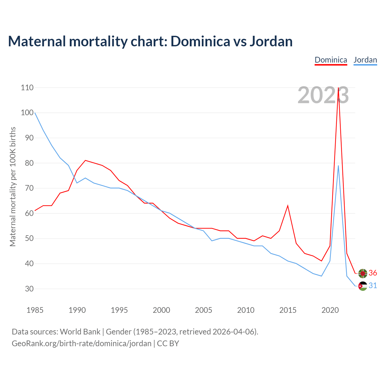 The maternal mortality rate, which is the probability of dying during childbirth or within 42 days of pregnancy termination, is 36 deaths per 100,000 live births in Dominica, compared to 31 deaths in Jordan.