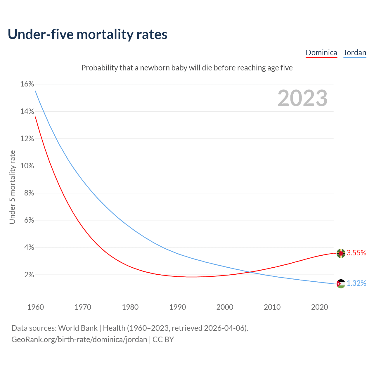 The chance that a newborn baby will die before reaching age five is 3.55% in Dominica and 1.32% in Jordan. Above is a chart with historical data on under-five mortality rates.
