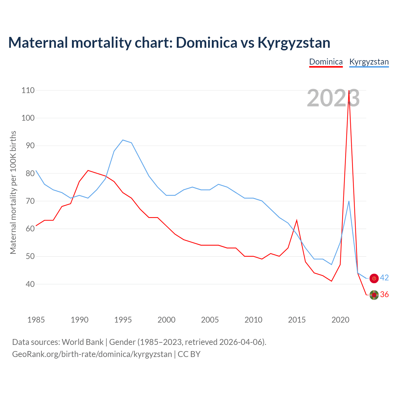 The maternal mortality rate, which is the probability of dying during childbirth or within 42 days of pregnancy termination, is 36 deaths per 100,000 live births in Dominica, compared to 42 deaths in Kyrgyzstan.