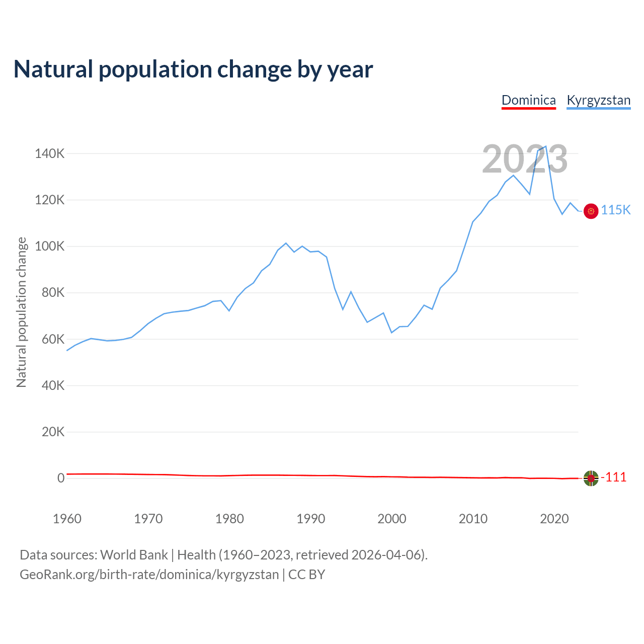 According to the latest available data on birth rates, the fertility rate in Dominica was 1.48 children per woman in 2023, compared to 2.7 in Kyrgyzstan in 2023. The replacement level is considered to be 2.1 children per woman.