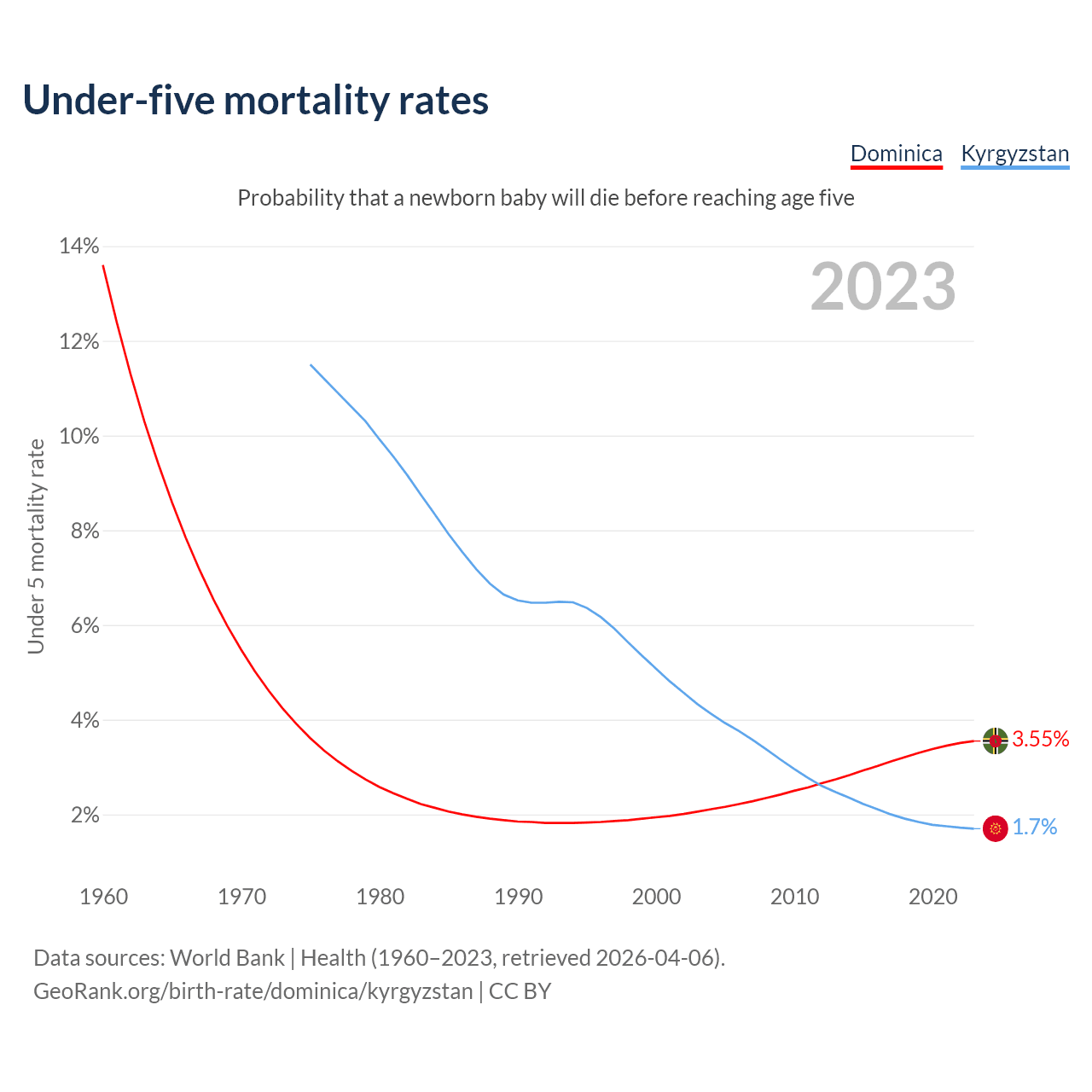 The chance that a newborn baby will die before reaching age five is 3.55% in Dominica and 1.7% in Kyrgyzstan. Above is a chart with historical data on under-five mortality rates.
