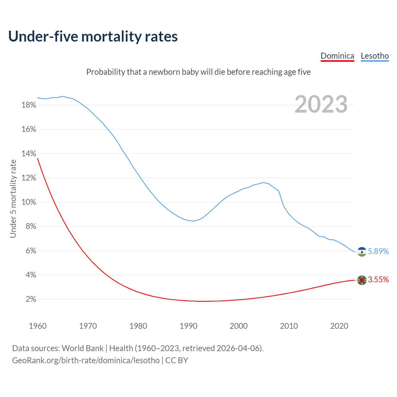 The chance that a newborn baby will die before reaching age five is 3.55% in Dominica and 5.89% in Lesotho. Above is a chart with historical data on under-five mortality rates.