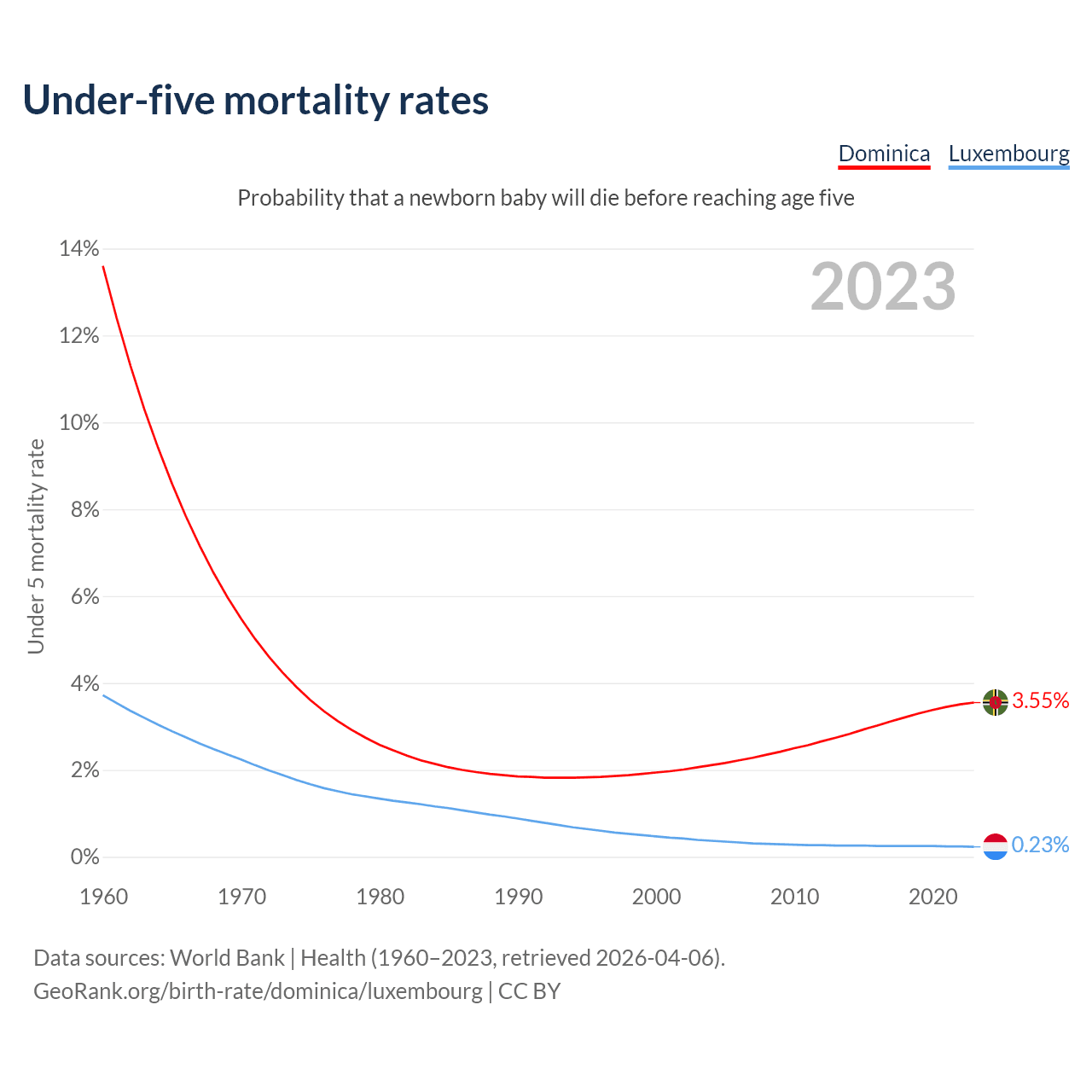 The chance that a newborn baby will die before reaching age five is 3.55% in Dominica and 0.23% in Luxembourg. Above is a chart with historical data on under-five mortality rates.