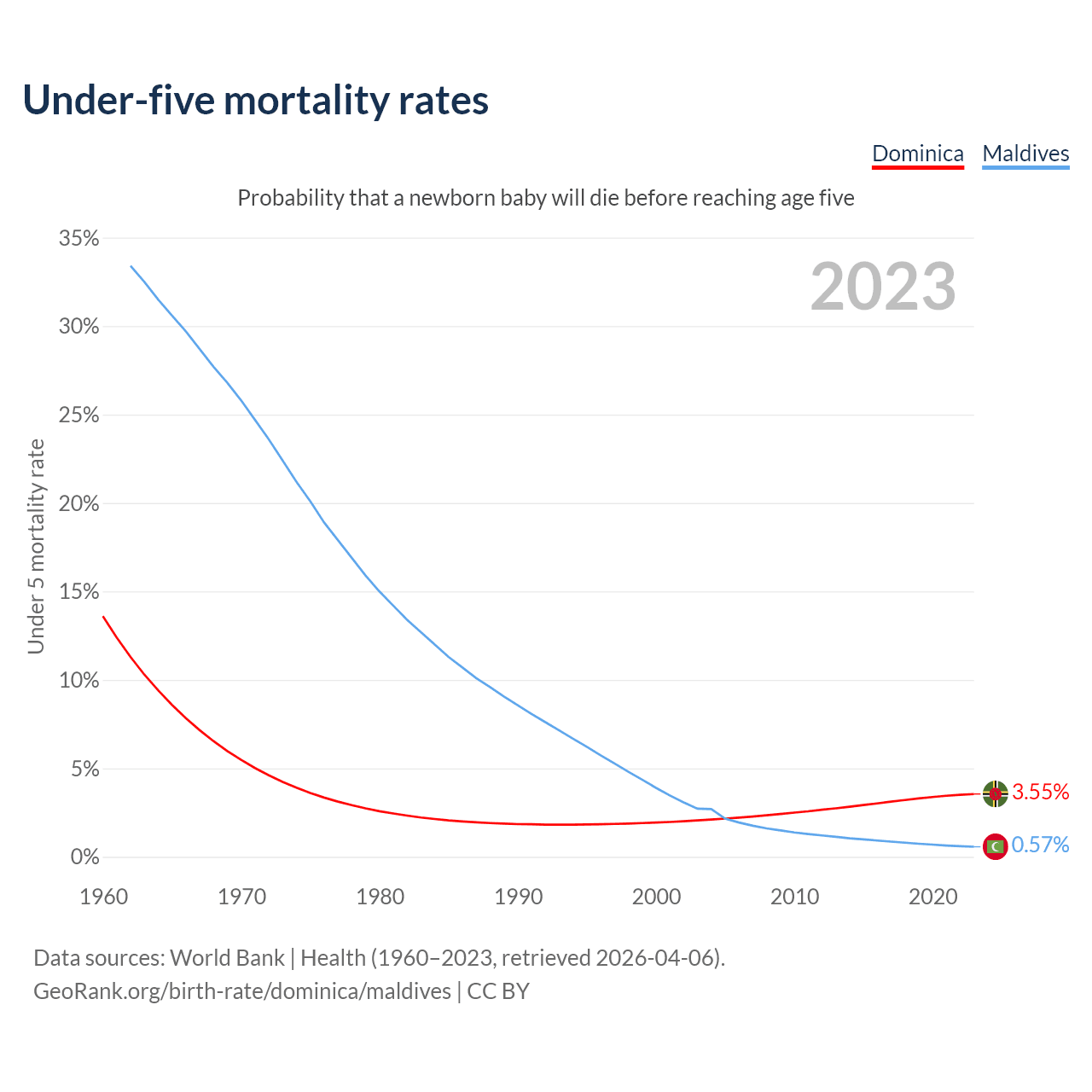 The chance that a newborn baby will die before reaching age five is 3.55% in Dominica and 0.57% in Maldives. Above is a chart with historical data on under-five mortality rates.