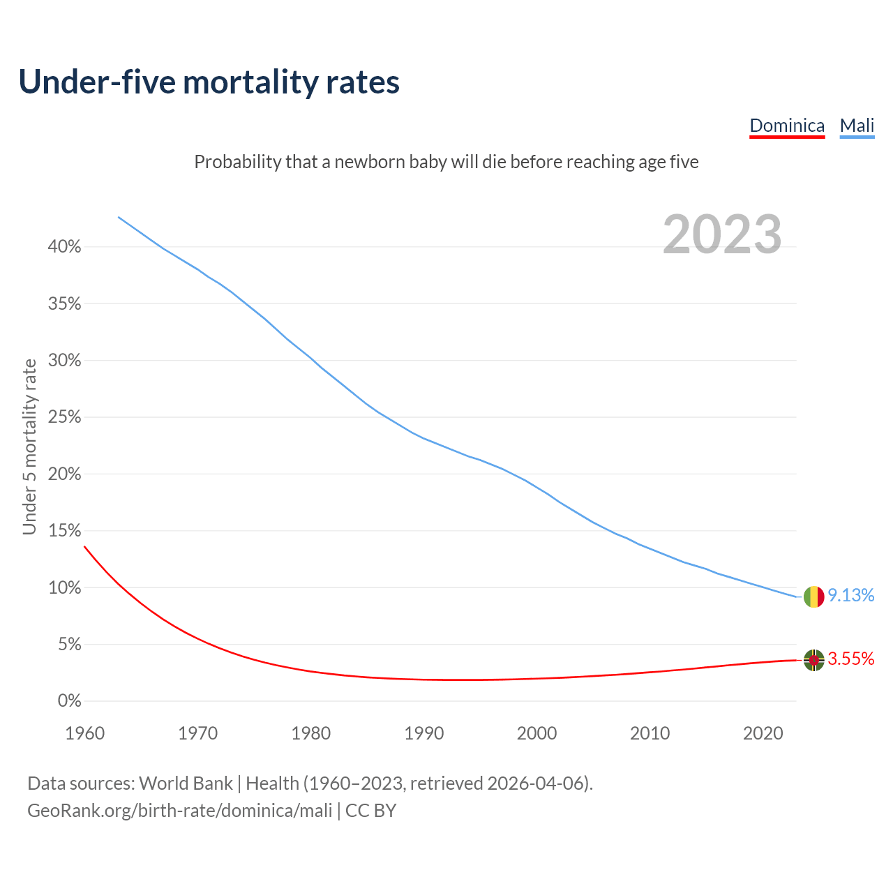 The chance that a newborn baby will die before reaching age five is 3.55% in Dominica and 9.13% in Mali. Above is a chart with historical data on under-five mortality rates.