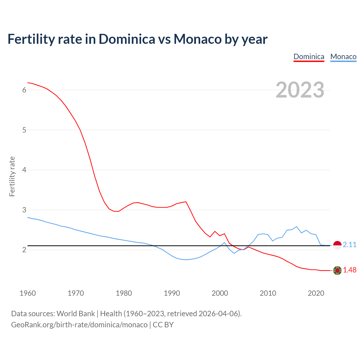 1960 vs 2023, the fertility rate has decreased by 76% in Dominica and by 25% in Monaco — in 1960, it was 6.18 and 2.81, respectively.