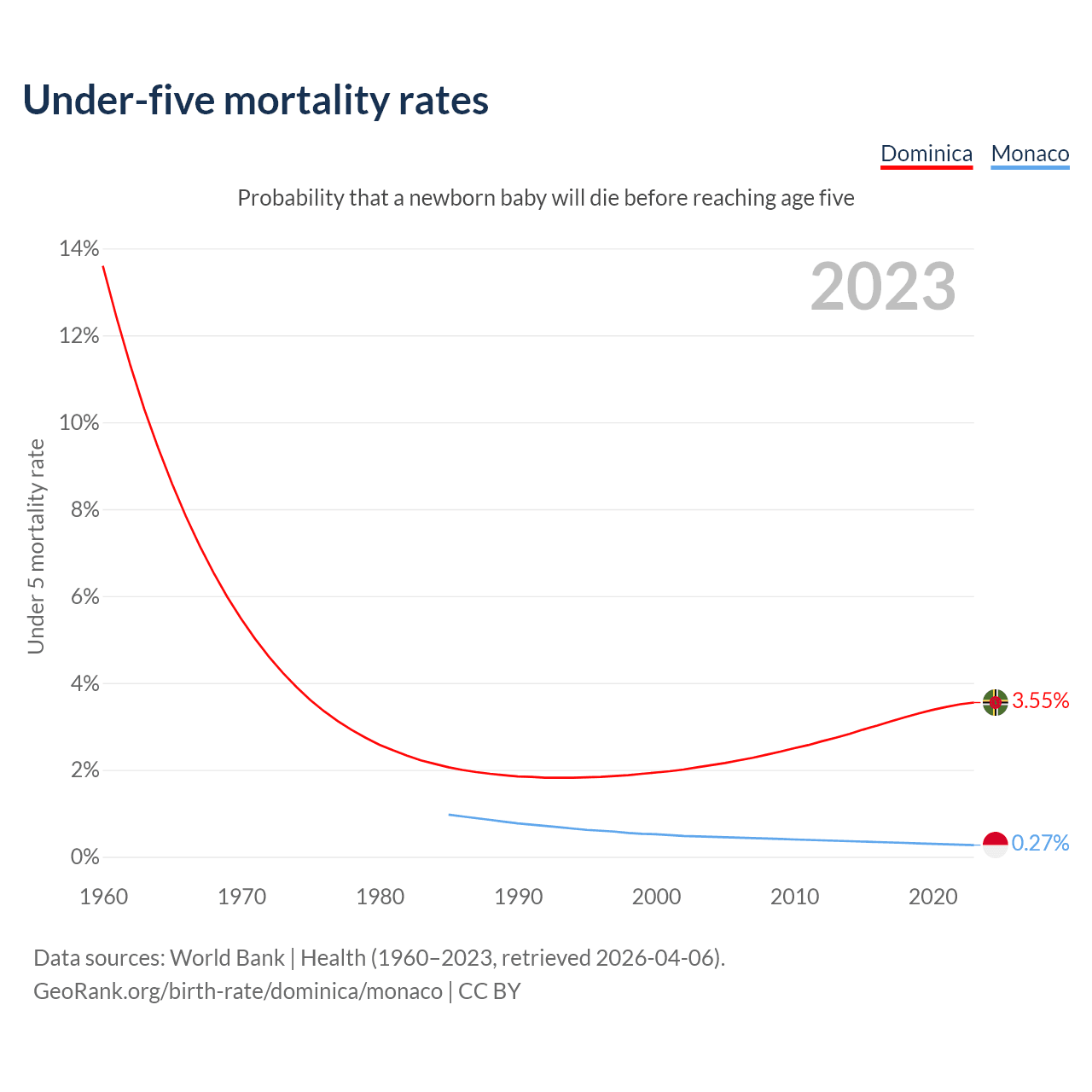 The chance that a newborn baby will die before reaching age five is 3.55% in Dominica and 0.27% in Monaco. Above is a chart with historical data on under-five mortality rates.