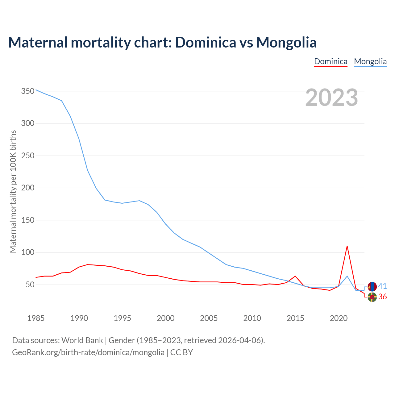 The maternal mortality rate, which is the probability of dying during childbirth or within 42 days of pregnancy termination, is 36 deaths per 100,000 live births in Dominica, compared to 41 deaths in Mongolia.