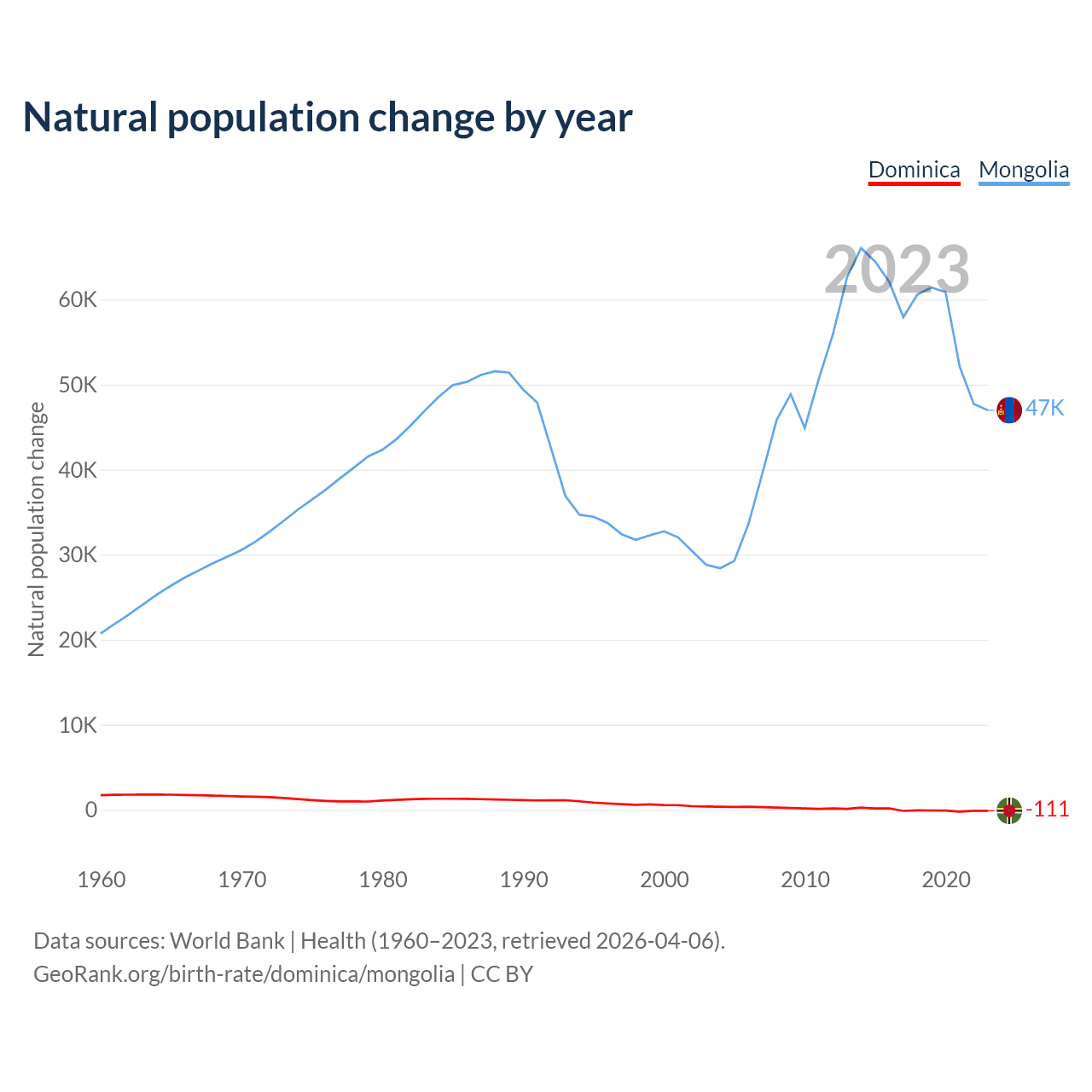 According to the latest available data on birth rates, the fertility rate in Dominica was 1.48 children per woman in 2023, compared to 2.7 in Mongolia in 2023. The replacement level is considered to be 2.1 children per woman.