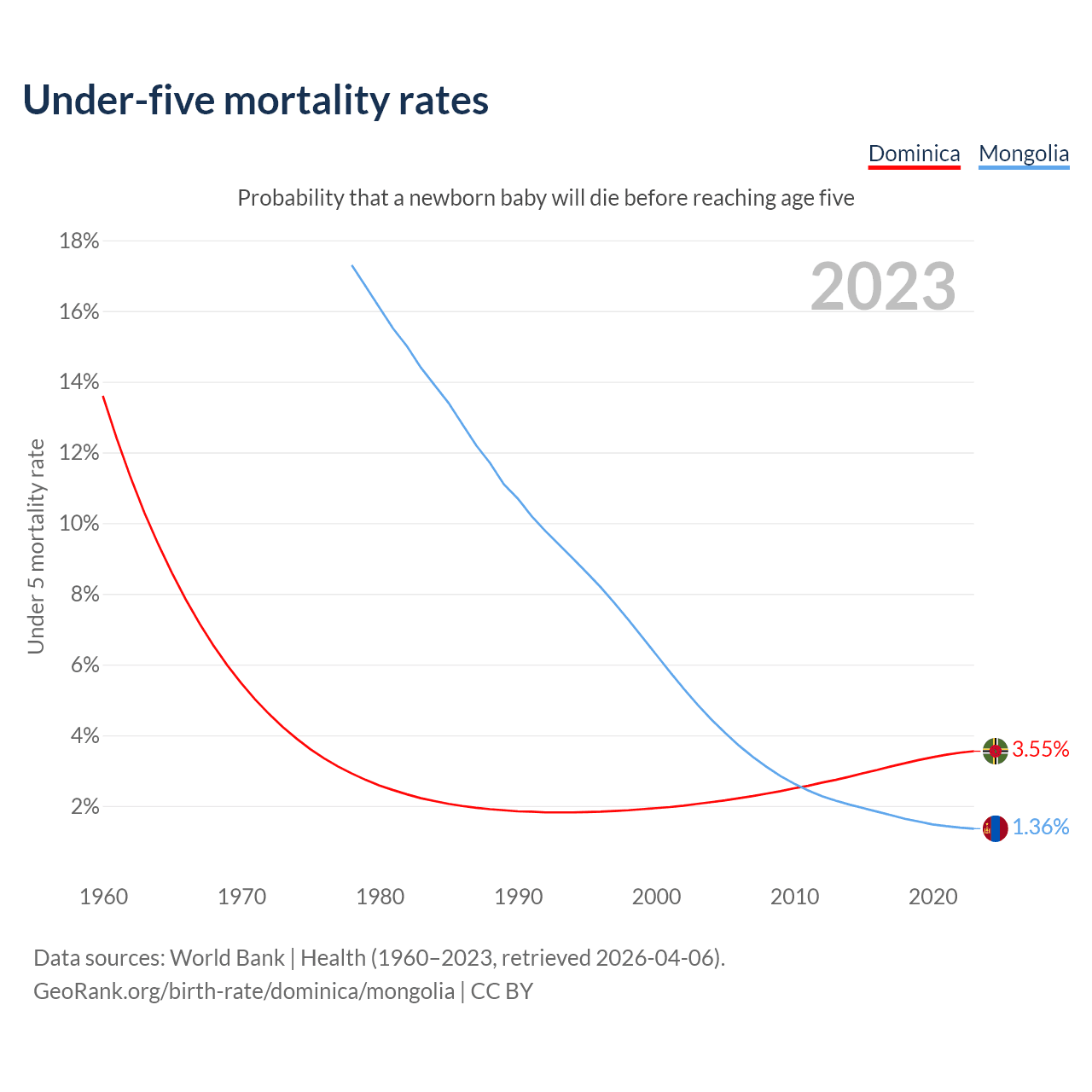 The chance that a newborn baby will die before reaching age five is 3.55% in Dominica and 1.36% in Mongolia. Above is a chart with historical data on under-five mortality rates.