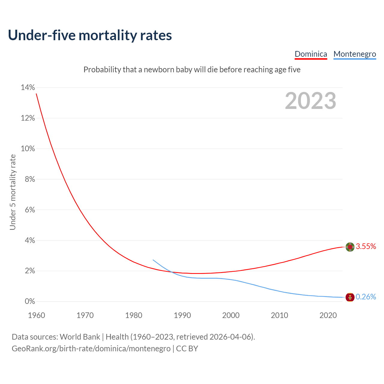 The chance that a newborn baby will die before reaching age five is 3.55% in Dominica and 0.26% in Montenegro. Above is a chart with historical data on under-five mortality rates.