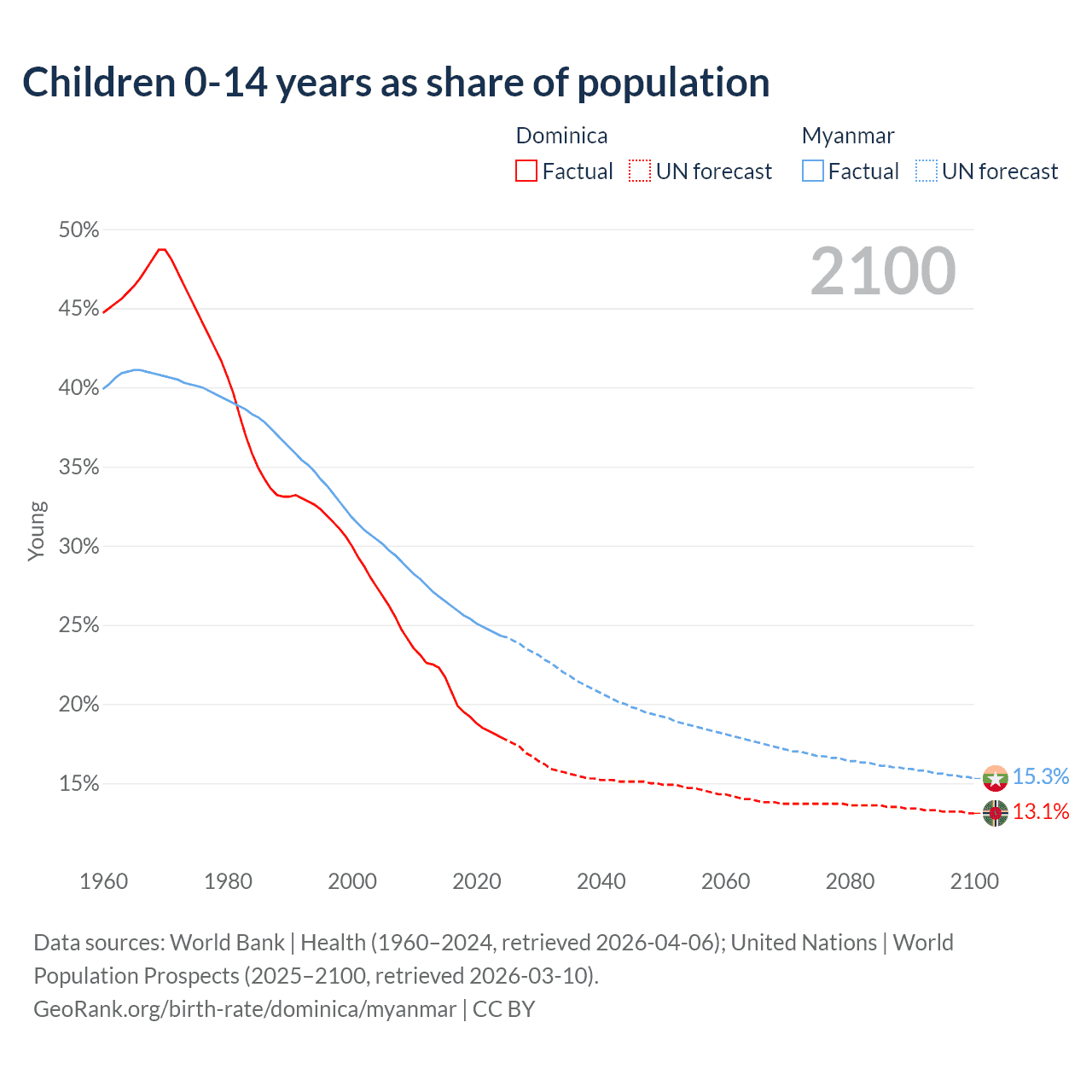 According to the latest available data on birth rates, the fertility rate in Dominica was 1.48 children per woman in 2023, compared to 2.12 in Myanmar in 2023. The replacement level is considered to be 2.1 children per woman.
