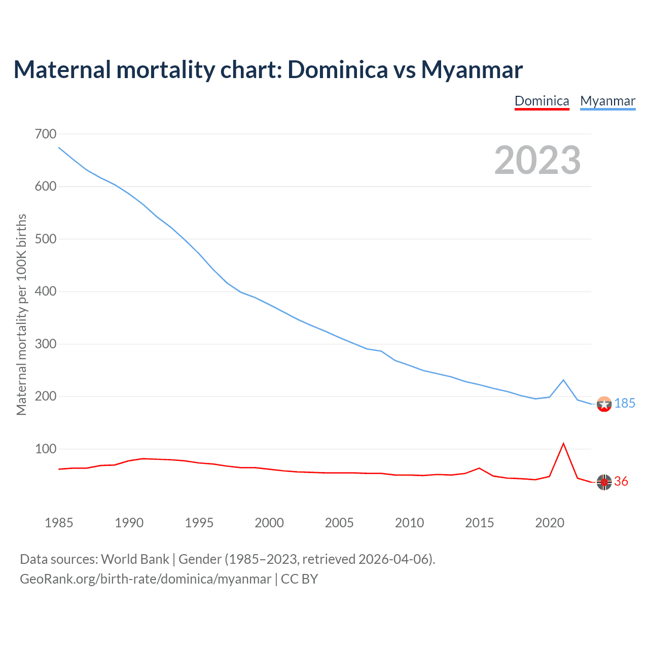 The maternal mortality rate, which is the probability of dying during childbirth or within 42 days of pregnancy termination, is 36 deaths per 100,000 live births in Dominica, compared to 185 deaths in Myanmar.