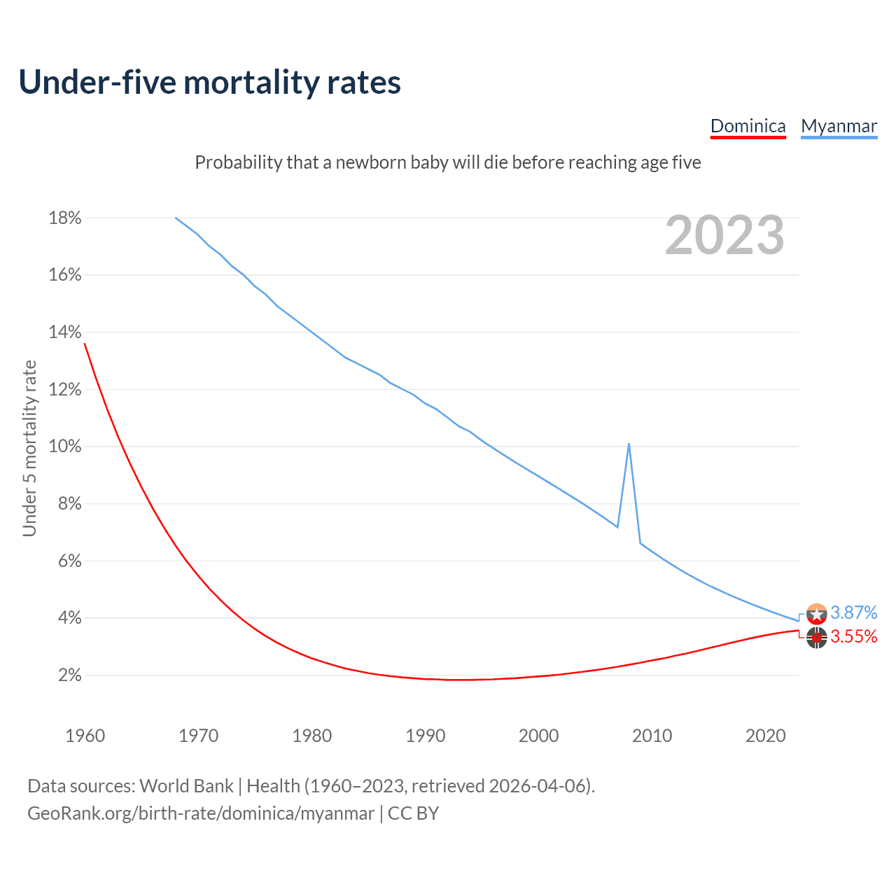 The chance that a newborn baby will die before reaching age five is 3.55% in Dominica and 3.87% in Myanmar. Above is a chart with historical data on under-five mortality rates.