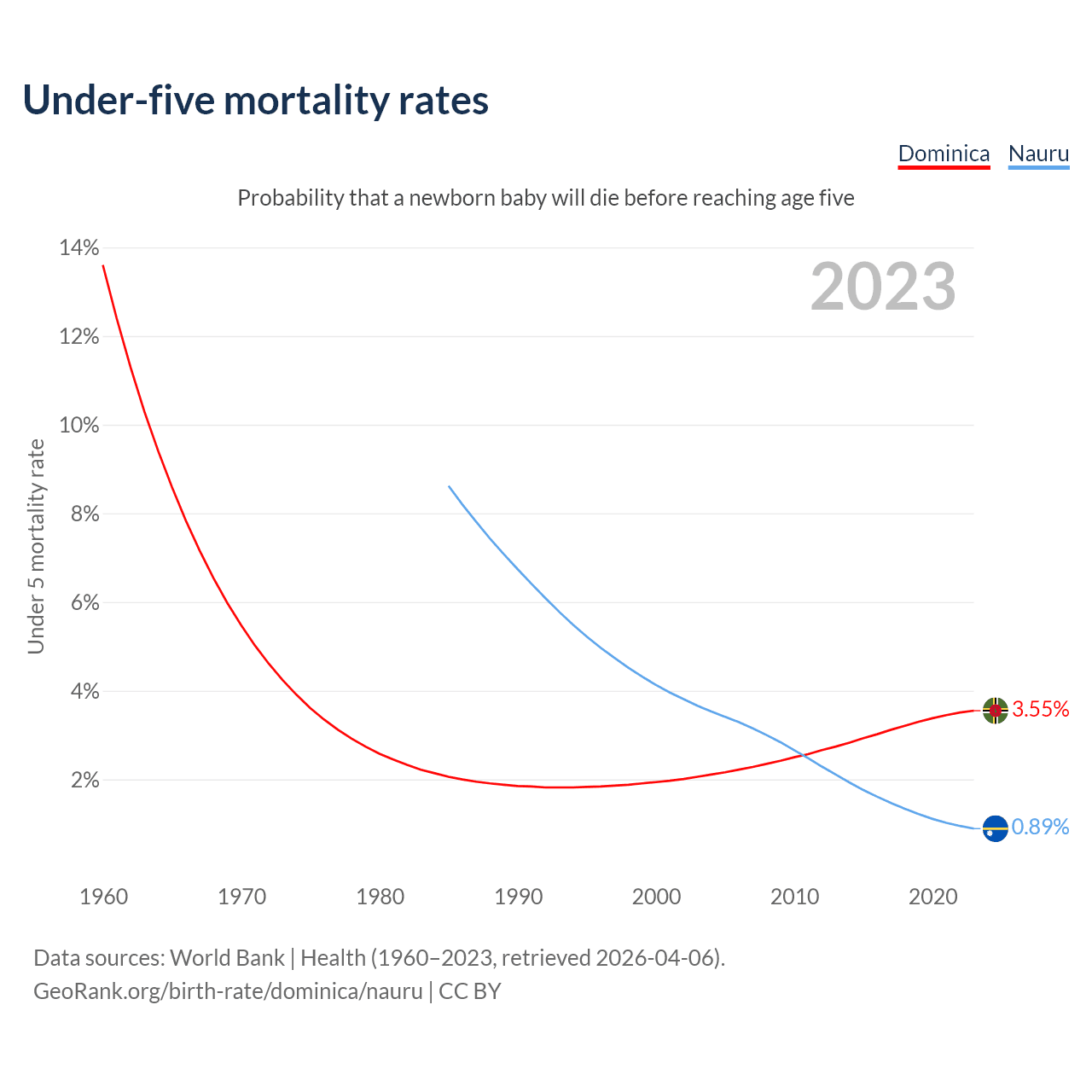 The chance that a newborn baby will die before reaching age five is 3.55% in Dominica and 0.89% in Nauru. Above is a chart with historical data on under-five mortality rates.