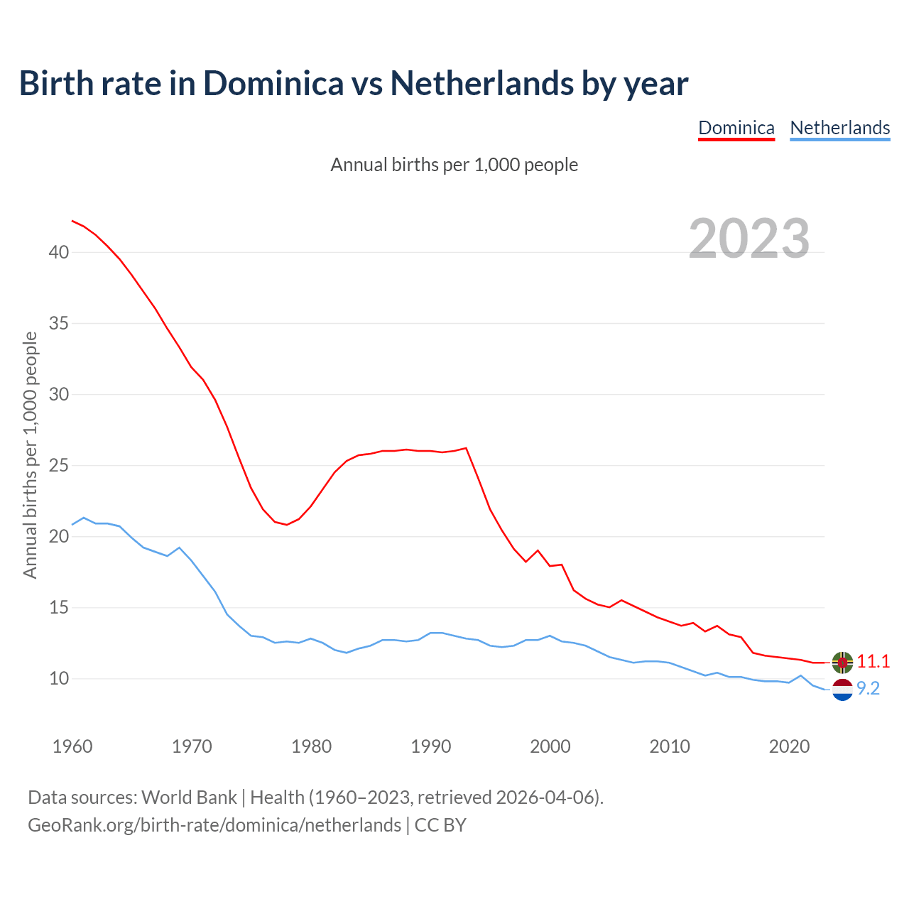Dominica has an annual birth rate of 11.1 births per 1,000 people, compared to 9.2 for the Netherlands. The average number of children a woman is expected to have during her lifetime — the fertility rate, is 1.48 in Dominica and 1.43 in the Netherlands — 3.64% difference.