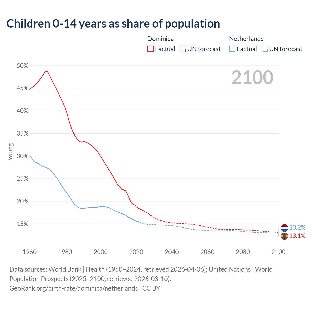 According to the latest available data on birth rates, the fertility rate in Dominica was 1.48 children per woman in 2023, compared to 1.43 in the Netherlands in 2023. The replacement level is considered to be 2.1 children per woman.