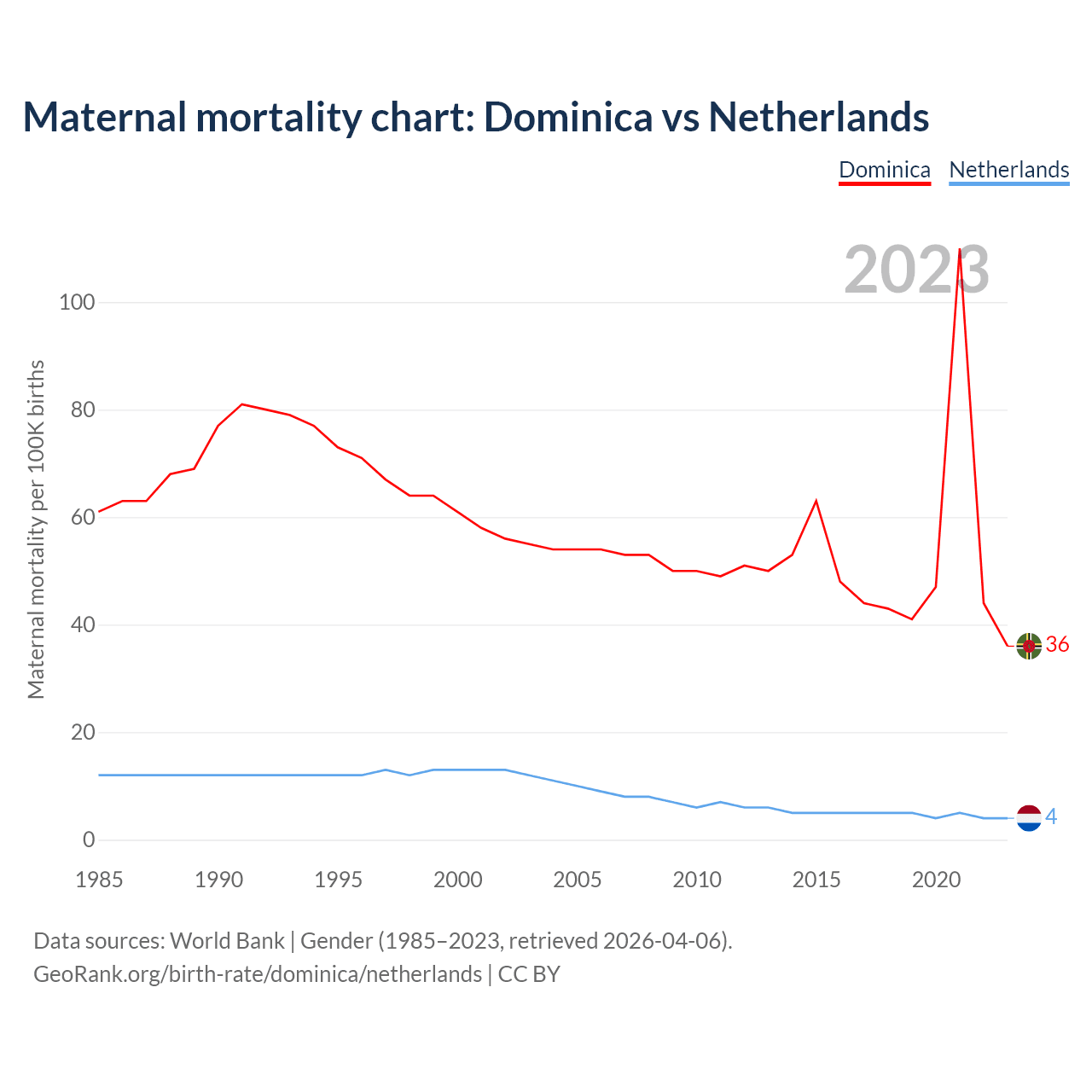 The maternal mortality rate, which is the probability of dying during childbirth or within 42 days of pregnancy termination, is 36 deaths per 100,000 live births in Dominica, compared to 4 deaths in the Netherlands.