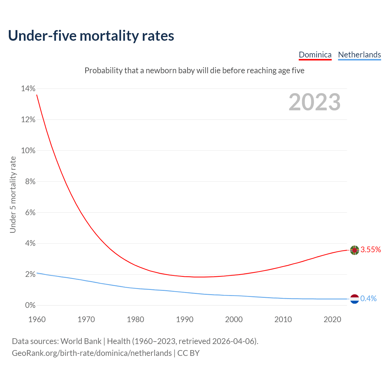 The chance that a newborn baby will die before reaching age five is 3.55% in Dominica and 0.4% in the Netherlands. Above is a chart with historical data on under-five mortality rates.