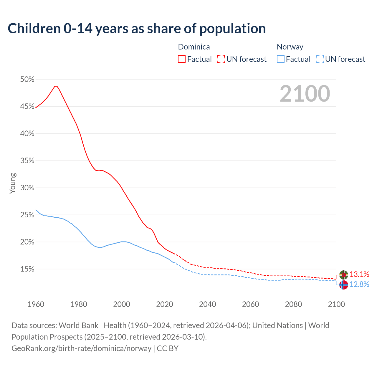 According to the latest available data on birth rates, the fertility rate in Dominica was 1.48 children per woman in 2023, compared to 1.4 in Norway in 2023. The replacement level is considered to be 2.1 children per woman.