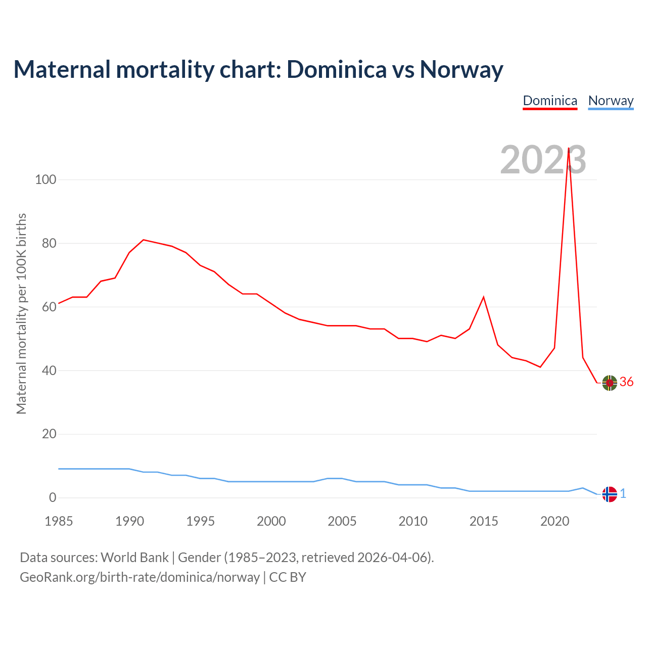 The maternal mortality rate, which is the probability of dying during childbirth or within 42 days of pregnancy termination, is 36 deaths per 100,000 live births in Dominica, compared to 1 deaths in Norway.