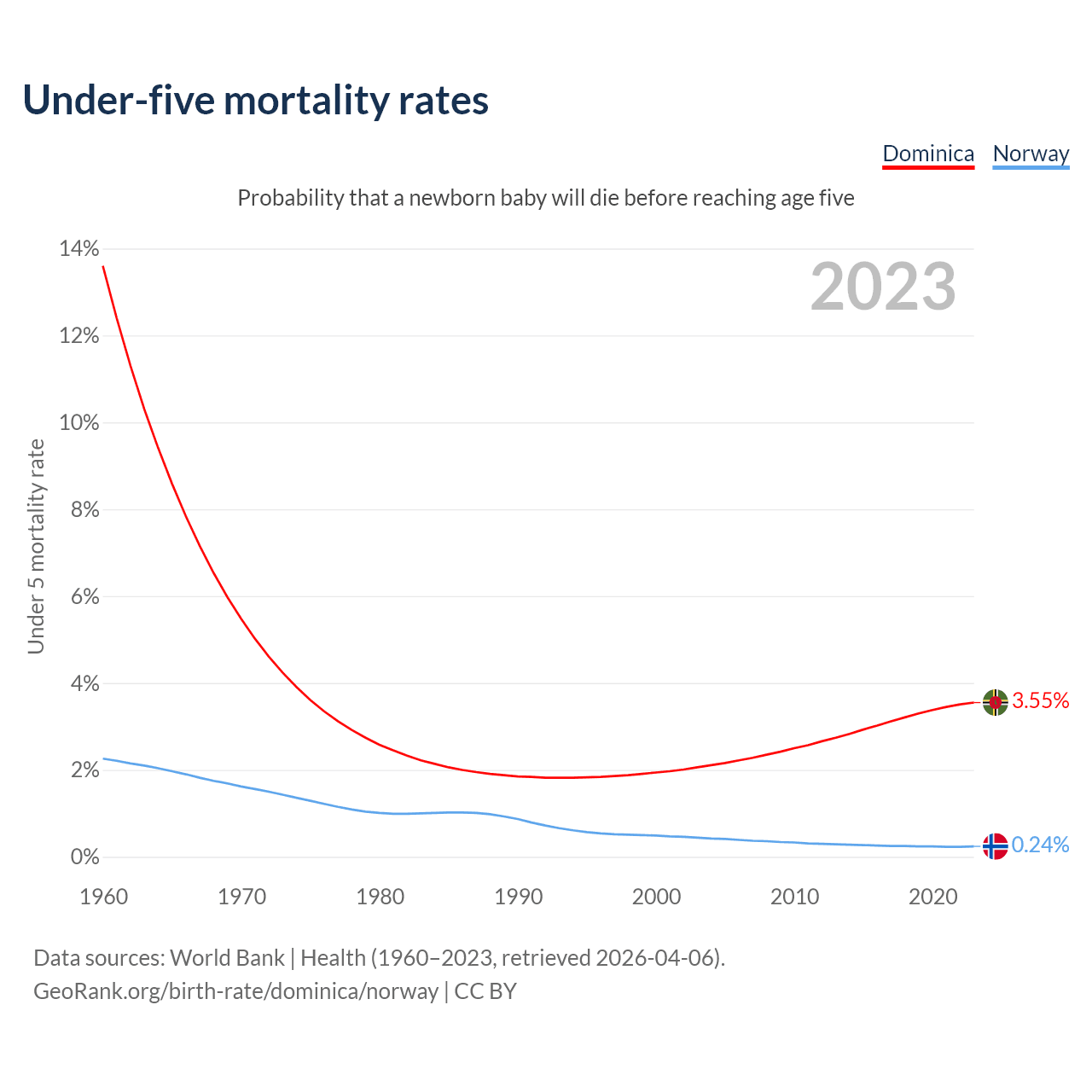 The chance that a newborn baby will die before reaching age five is 3.55% in Dominica and 0.24% in Norway. Above is a chart with historical data on under-five mortality rates.