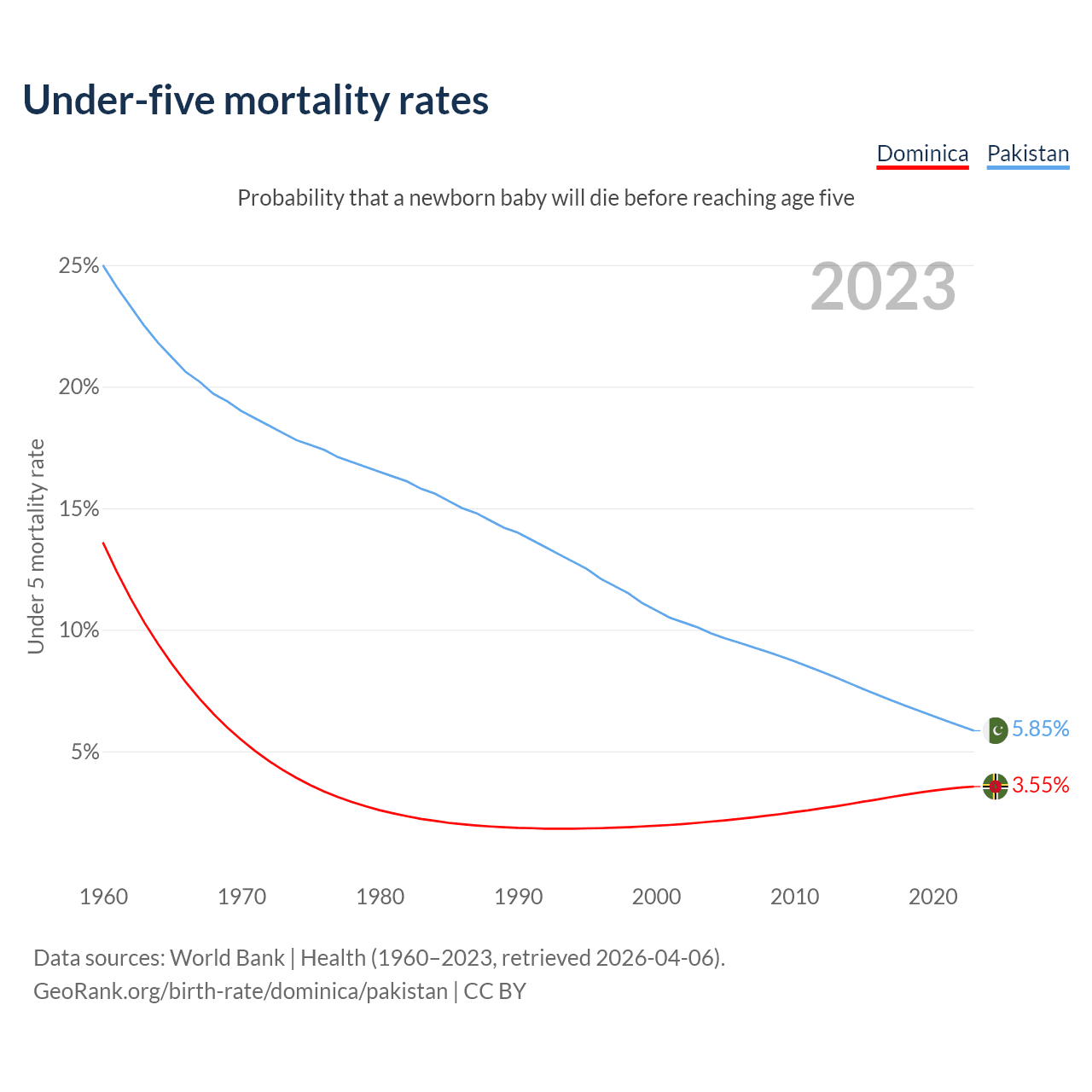 The chance that a newborn baby will die before reaching age five is 3.55% in Dominica and 5.85% in Pakistan. Above is a chart with historical data on under-five mortality rates.